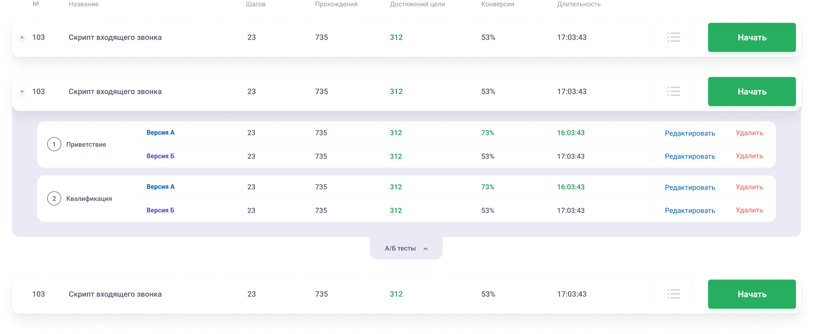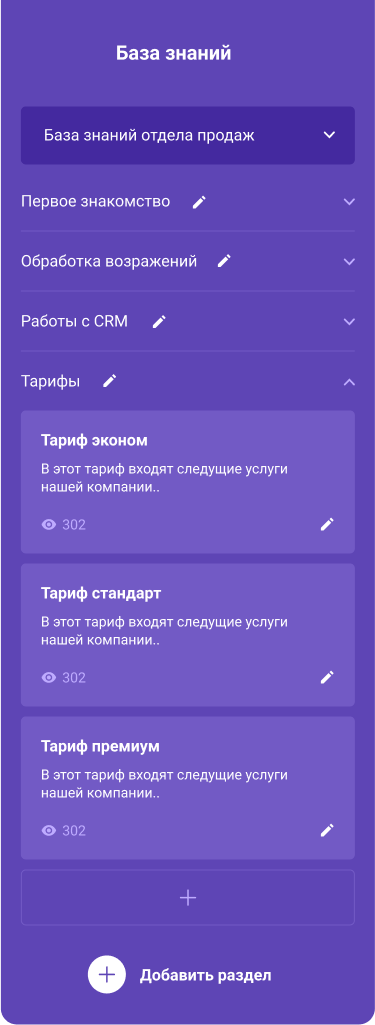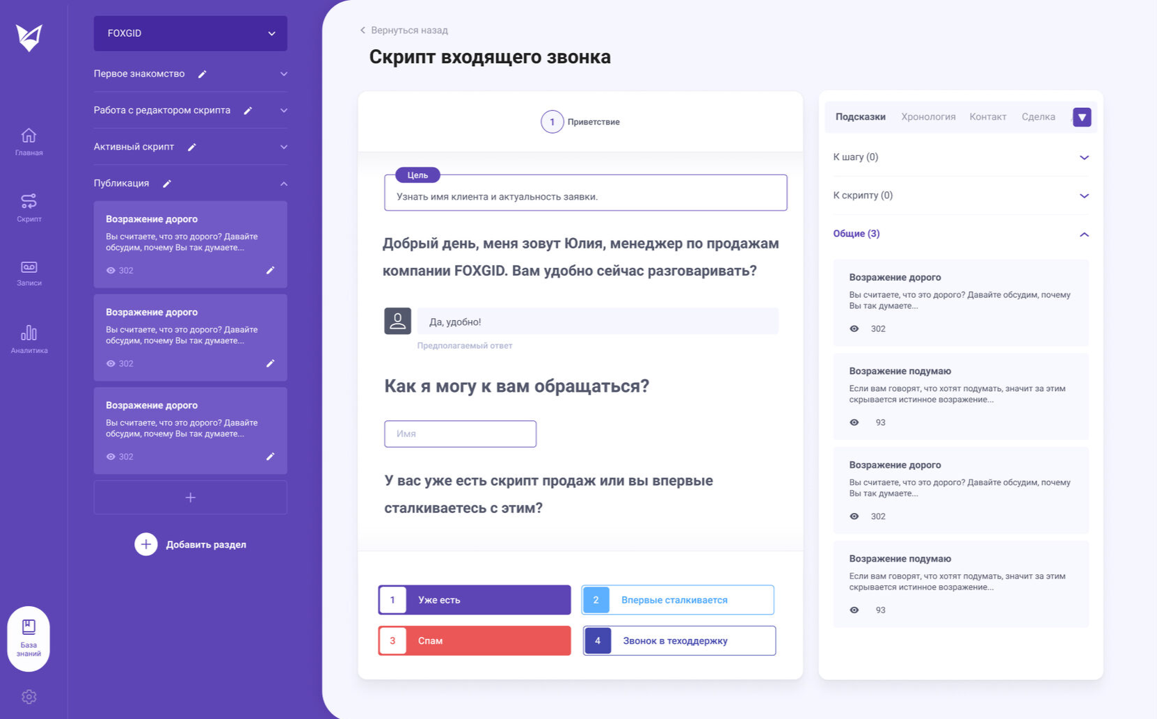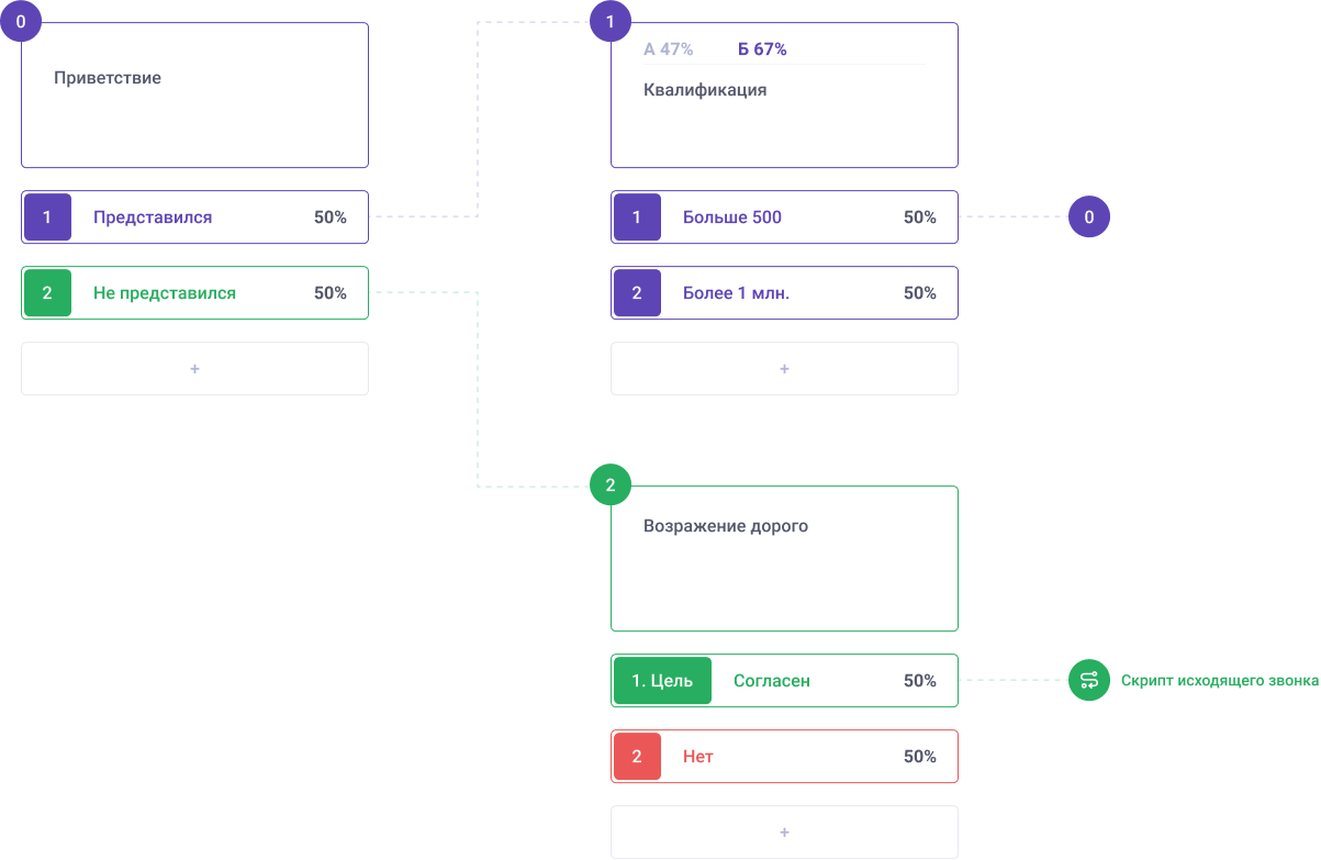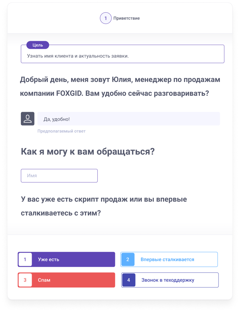 ... и вариантами ответов, которые ведут к следующим шагам скрипта продаж